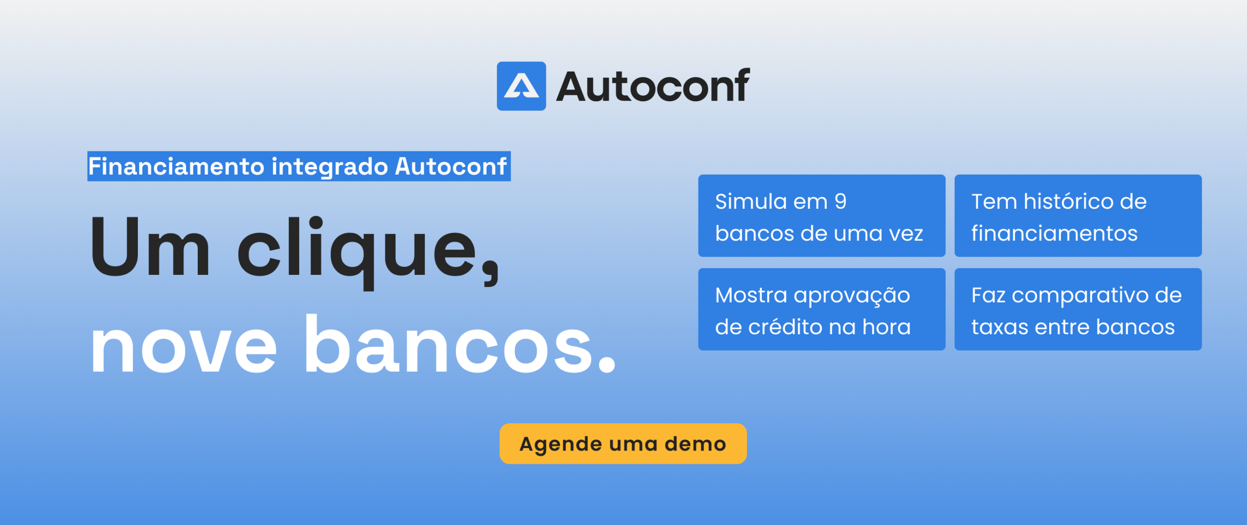 O Autoconf conta com um poderoso Integrador Financeiro que conecta a sua loja simultaneamente aos maiores e melhores bancos do mercado nacional. Com apenas um único clique rápido e seguro, o gestor da área consegue enviar a ficha do cliente e receber as aprovações de crédito e as melhores taxas de forma instantânea diretamente na tela do sistema.