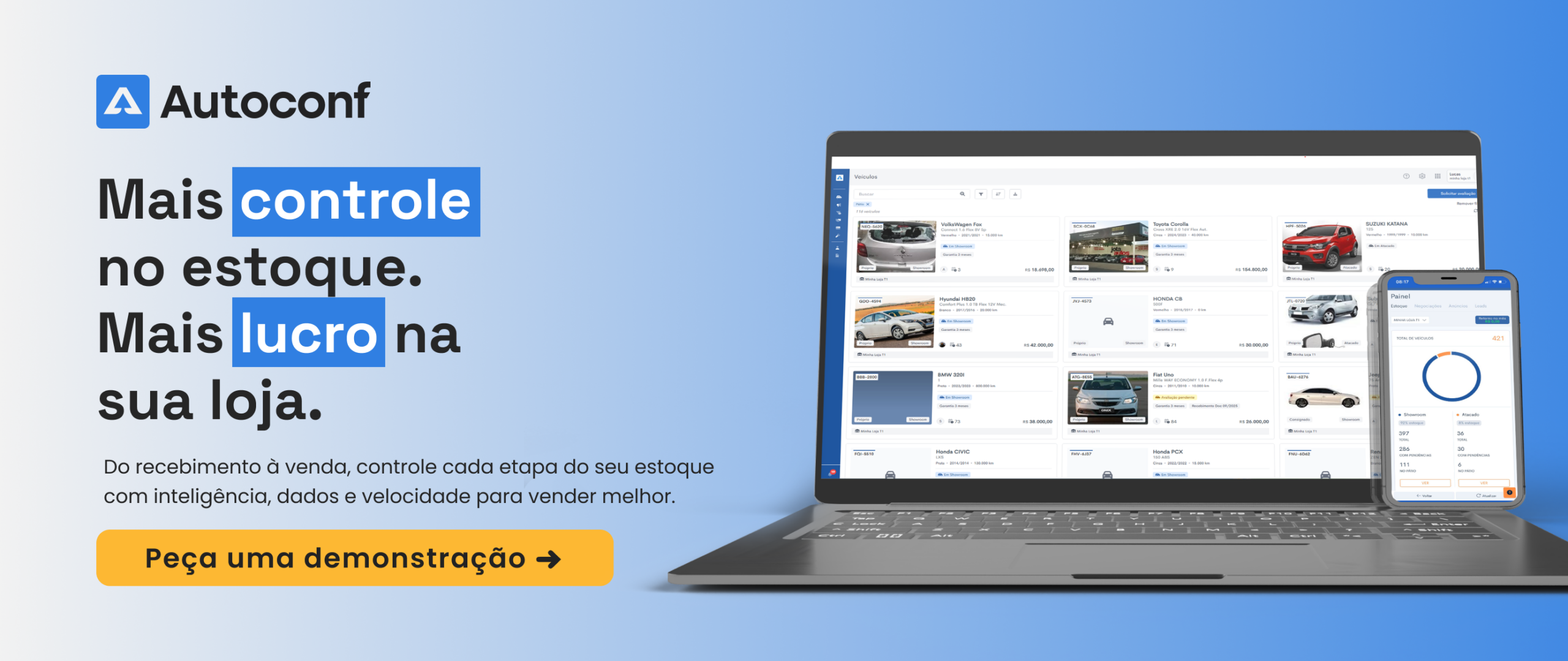 O nosso sistema tecnológico integra fluidamente todas as etapas da vida do veículo dentro da sua loja física e virtual. Desde a aprovação detalhada da compra na rua, passando pelo acompanhamento de cada status na oficina parceira, até a publicação rápida e automática nos maiores portais de classificados do país.